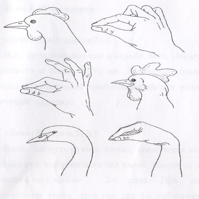 Оң қолдың бүгілген 2-ші саусағы – «Балаң үйрек» пен 5-ші саусақ – «Кішкентай бөбек» – «құлақ», алға қарай созылып домалақтанған қалған саусақтар – «тышқанның тұмсығы». Сол қол алақанынан «тамақ» жейді.
