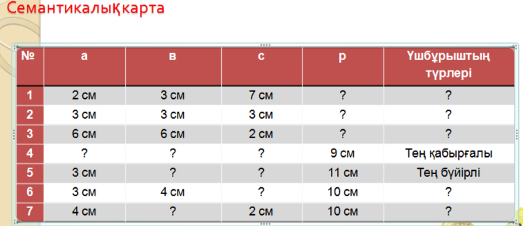 Дескриптор І топ: ∆-дың бұрыштарына байланысты түрлерін ажырата алады. ІІ топ: ∆-ң қабырғаларының ұзындықтарына байланысты түрлерін ажырата алады ІІІ топ: Әлемде кездесетін үшбұрыштарға мысалдар келтіре алады |