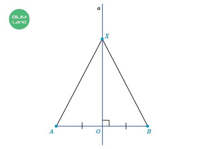 Өткен сабақты пысықтау. Кесіндінің ортасы арқылы өтетін және осы кесіндіге перпендикуляр болатын түзуді орта перпендикуляр деп атайды. Теорема. Кесіндіге жүргізілген орта перпендикулярдың әрбір нүктесі осы кесіндінің ұштарынан бірдей қашықтықта жатады. Дәлелдеу. X – AB кесіндісіне жүргізілген a орта перпендикулярының кез келген нүктесі болсын. O нүктесі – AB кесіндісінің ортасы. XA = XB екенін дәлелдеу керек.