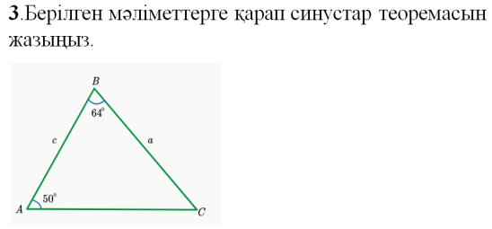 Дескриптор: -сызбасын сызады -косинустар теоремасын қолданады. - бұрышты табады, Бағалау: Әрбір дұрыс жауапка 1 балл қойылады |