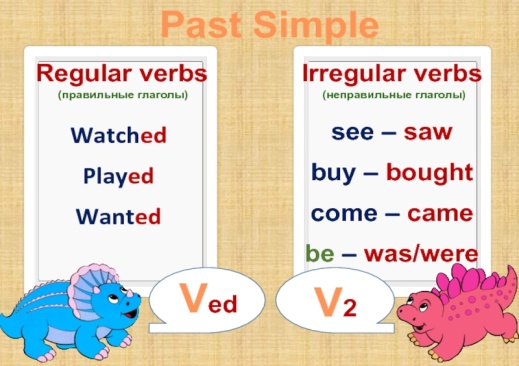 You are in the 1st group You are in the 2nd group You are in the 3rd group New words: Words wall Can |kæn|- істей алу do |du:| істеу swim |swɪm| жүзу go |ɡəʊ| бару eat |iːt| тамақ ішу buy |baɪ| сатып алу put |pʊt| қою read |riːd| оқу write |raɪt| жазу take |teɪk| алу III. Explain the new lesson. Past simple regular and irregular verbs The Past Simple Tense is a verb tense used to describe actions or events that occurred in the past and are now finished. It is also called the Simple Past Tense. In English, regular verbs are formed by adding -ed to the base form of the verb, while irregular verbs have their own unique past tense forms. In sentences, it usually follows this structure: Subject + past verb + object. For example: