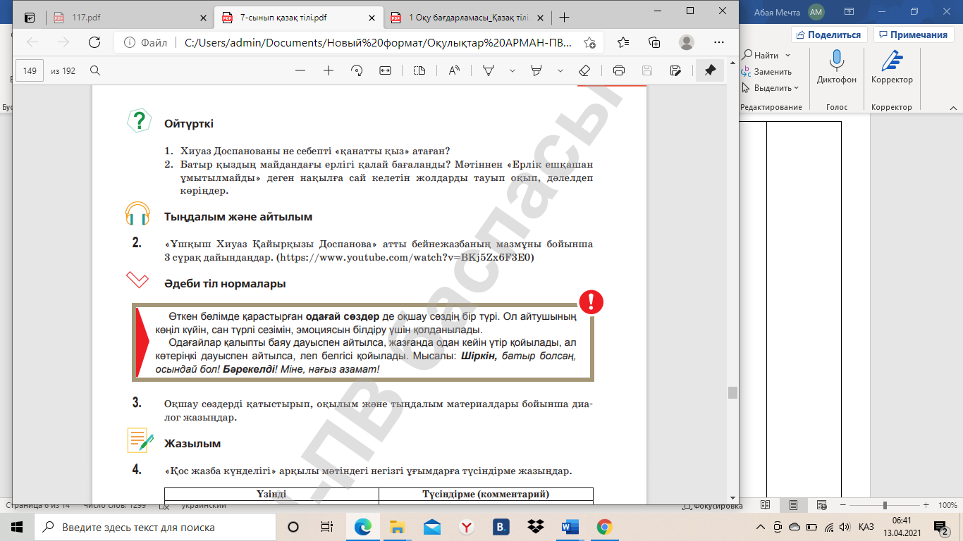 1-тапсырма. Ой шақыру. https://www.youtube.com/wath?v «Ұшқыш Хиуаз Доспанова» атты бейнежазбаны тыңдай отырып, батыр қыз туралы мәлімет алады.