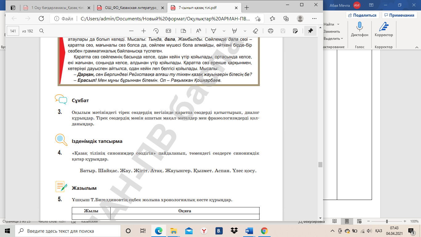 Оқушыларға Т. Бигелдинов туралы мәтін беріледі. Оқушылар мәтінмен танысады және суретті ақпаратты оқып, мәлімет жинақтайды. «Мен қоятын үш сауал» әдісімен сұрақтар құрастырады; Жауап дайындайды; Жауаптарын тексереді; «Кластер» әдісімен мәтінді талдайды; Мәтіннен ерекше әсер еткен немесе ой салған дәйексөз келтіреді; Жеке түсінік береді; Мұғалімге сұрақ береді. Грамматикалық тақырыпты меңгереді. Оқылым мәтініндегі тірек сөздердің негізінде қаратпа сөздерді қатыстырып, диалог құрады; Тірек сөздердің мәнін ашатын мақал-мәтелдер мен фразеологизмдерді қолданады; Берілген оқшау сөздерді мағынасына қарай топтастырады; Берілген оқшау сөздерді қатыстырып, сөйлем құрайды. |