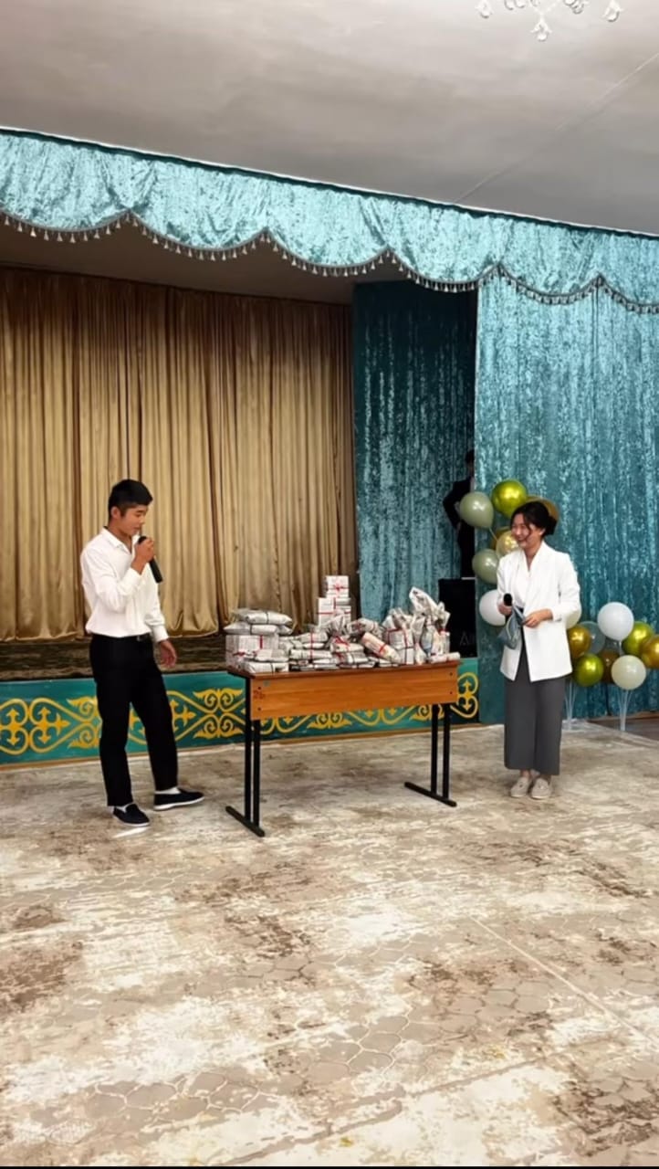Жанболат: Бүгінгі салтанатты мерекелік кешімізді ашу үшін құттықтау сөз мектеп директоры – Айтназаров Мұрат Шикалұлына беріледі.