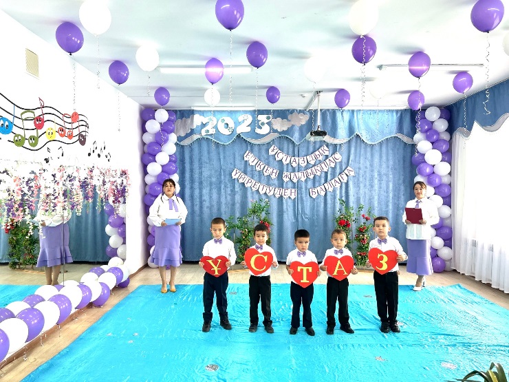 Камшат: Бүгін бізде үлкен мереке. Бүгін ұстаздар қауымының төл мерекесі. Олай болса бүгінгі күн ұстаздарға арналмақ. Күн сәулесі өмірге қандай жарық берсе, ұстаз есімі де шәкірттерге күндей жарық береді.Ендеше «Алтын сақа» тобы бүлдіршіндерінің өздеріңізге арнаған өлең-шумақарын қабыл алыңыздар!