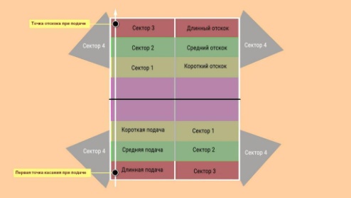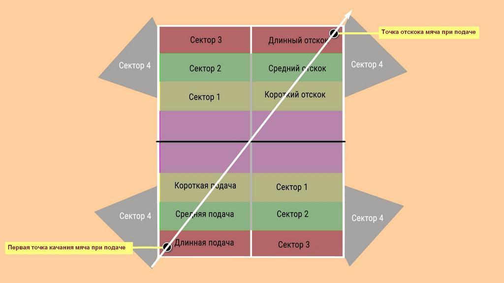 Сонымен, бірдей түстегі секторлар мақсат болып табылады. 1-мақсат - допты оның жартысына тигізіп, 2-ші гол - қарсыластың жағында. Қызмет көрсету кезінде допты бірдей түсті бөліктерде соғу керек. Бұл қабылдау кезінде қарсыластың шешілмеген қателік жасауына мүмкіндік береді.