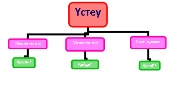 1 – тапсырма Топтық жұмыс Постер қорғау Постерге әр топ өз болашақтан күтер арманы мен жоспарын жазады: Ішінде өлең жолдары мен салынған суреттері де болса болады. 1 – топ «Болашақтағы менің сыныптастарым» 2 – топ «Болашақтағы Қазақ елі» 3 – топ «Болашақтағы біздің мектеп Жарайсыңдар! Балалар,біз осы уақытқа дейін қандай сөз таптарын өттік? Бүгін біз өзіміздің білім қоржынымыз жаңа сөз табымен толығады: Үстеу – іс – әрекеттің мезгілін, мекенін, сын – қимылын білдіретін сөз табын айтады. Үстеулер қалай? Қайда? Қашан? деген сұрақтарға жауап береді. Жүрдек пойызбен Астанаға тез жеттік. Биыл қаланы көруге ардым.