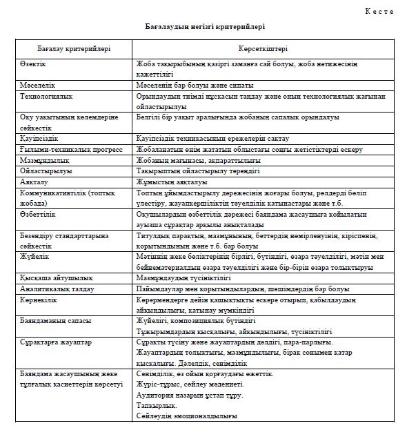 Жобаны бағалау критерийлері түсінікті болуға тиіс, олар 7–10-нан аспауы керек. Презентация ғана емес, барлық жасалған жұмыстың сапасы бағалануы тиіс [5].