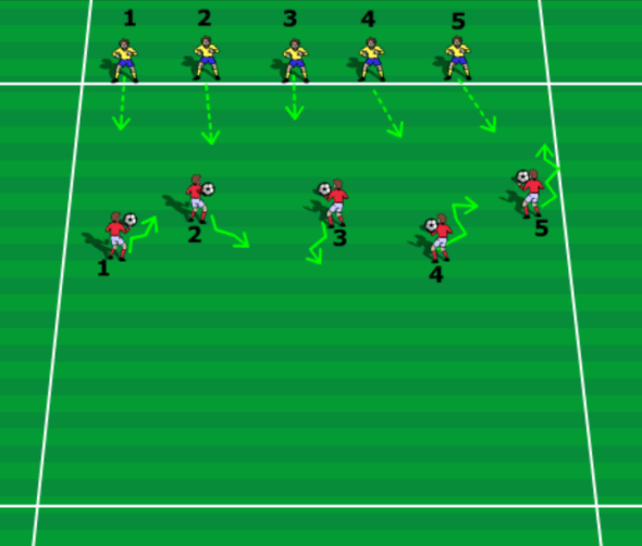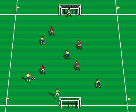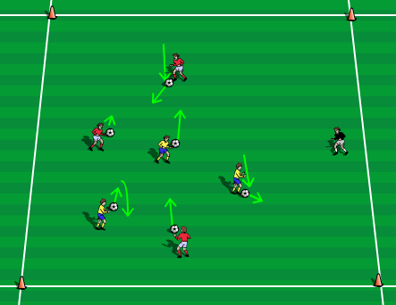 Міндеті: допты қадағалау дағдысын бекіту. Футболшылардың ойын кезінде жан-жақтарын (кеңістікті) бағдарлай білу біліктіліктерімен таныстыру. Мазмұны: көлемі 20×20 м болатын алаңда (20×40 м алаңының жартысы) аз құраммен ойнау. Қақпаның көлемі 1×1,5 м. Тапсырмаға қойылатын талаптар: допты қабылдаған соң, оны бірден теппей, техникалық тәсіл жасау керек: доппен «адымдап» қозғалу, доппен бұрылып, ойыншы жоқ аумаққа ауысу, жақсы көңіл-күйді сақтай білу, ойыннан ләззат алу. |