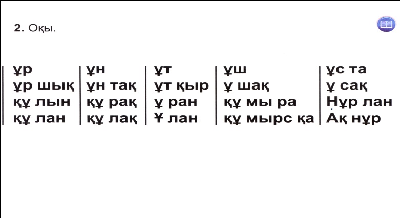 Сөздерді оқып қайталату. Буындап оқыту, тұтастай оқыту. Сөздердің мағынасын ажырату. Ұ дыбысы қай буында кездесетінін анықтату. Кері байланыс