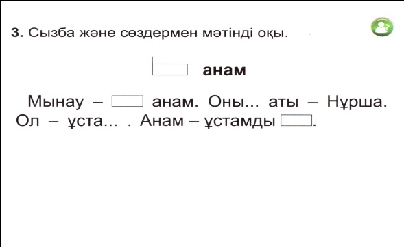 Сызбаны толықтыру. Мәтінді оқыту. Сұрақ қою арқылы мазмұнын ашу. Оқушыларға өз анасы туралы әңгімелету. Дескриптор: