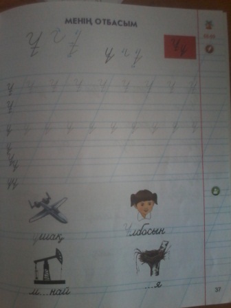 1.2.9.1. Әріпті тану, ажырату және оны дыбыспен сәйкестендіру. 1.1.4.1. Мәтіннің мазмұнын тақырыбы немесе оның иллюстрациясы бойынша болжау. 1.2.1.2. Оқудың түрлерін (буындап оқу, жиі кездесетін сөздерді тұтас оқу, түсініп оқу) қолдану. 1.2.1.1. Сөз/ сөйлем сызбасын оқу. 1.3.8.1. Жазу жолын, жоларалық кеңістікті, жолдың жоғарғы және төменгі сызығын сақтап, әріп элементтерін каллиграфиялық талаптарға сай жазу. |