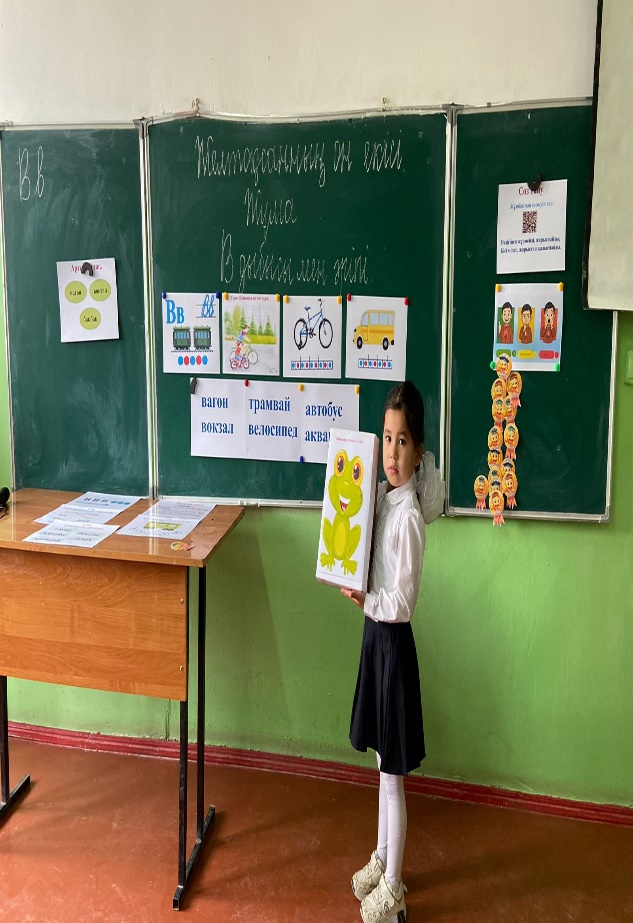 - Суреттен кімдерді көріп тұрсыңдар? - Олар не істеп жүр? -Велосипед туралы не білесіңдер? -Енді жаңа өздерің айтқан жауаптарыңды біріктіріп мәтін етіп айтыңдар. - Құраған әңгімелерің неше сөйлемнен тұрады? -Велосипед сөзіне дыбыстық талдау жасаңдар. Буынға бөліңдер. -В дыбысы сөздің қай жерінде тұр? -В дыбысының сөздің басында және ортасында, соңында да келетінін түсіндіру. - Ал енді в әрпінің сұлбасын ермексаздан, түймелерден жасаңдар. (Ұ, Д) 2 тапсырма: Оқылым «Бақаның тамағы» әдісі қолданылады. – Балалар, оқулықта берілген сөздерді, мәтінді барлығымыз бірге дауыстап оқиық.