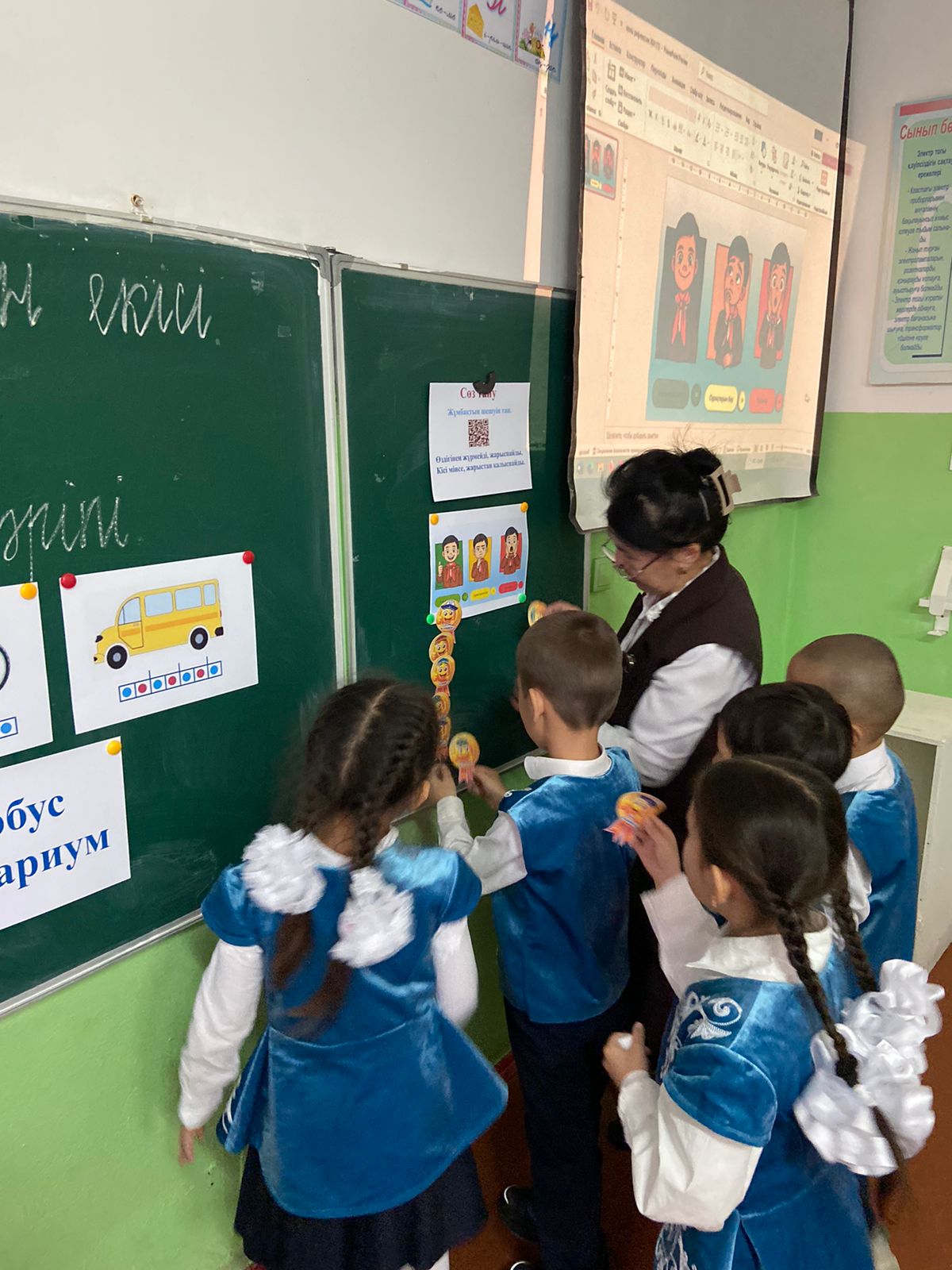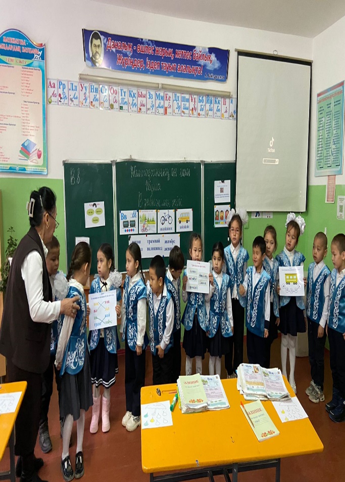 (Д) 4-тапсырмада дәптермен жұмыс жүреді. Жазылым 1. Партада дұрыс отырғызады. 2. Жазуға даярлауда бала қолының ұсақ бұлшықеттерін дамытатын жаттығулар жасатады. 3. Жазу: - дәптер бетіндегі кеңістікті бағдарлату; «В» әрпін тақтаға жазып көрсету. «В» әрпін ауада жазып көрсету. Дәптердегі тапсырманы орындату. Өзін-өзі бағалату: - Әр беттің соңында берілген дөңгелек- шартты белгілерді тапсырманы орындауларыңа қарай бояңдар. (Ұ) 5- тапсырма - «Сөз тану» айдары. А) QR кодта берілген мақалдың мәнін түсіндіру. Ә) Өткен сабақтардағы мақал-мәтел, жаңылтпаштарды еске түсіріп қайталау. Топтық жұмыс: ЕБҚ оқушыға: - В дыбысы бар буын құр - В дыбысы бар сөз құра. - В дыбысы бар сөзді қатыстырып сөйлем құрап айт.