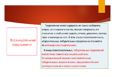 2.Прочитайте отрывок стихотворения А.Тетивкина.Какие чувства выражают восклицательные предложения? Попробуйте привести свои примеры. 3. РАБОТА С ПАМЯТКОЙ ВОСКЛИЦАТЕЛЬНЫЕ ПРЕДЛОЖЕНИЯ Предложение может содержать не только сообщение, вопрос, но и выражать чувства эмоции говорящего, его отношение к сообщению: радость, печаль, удивление, восторг, страх и восхищение и т.п. В этом случае повествовательные, вопросительные, побудительные предложения становятся по интонации восклицательными. В конце повествовательных, побудительных предложений вместо точки ставится восклицательный знак..