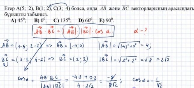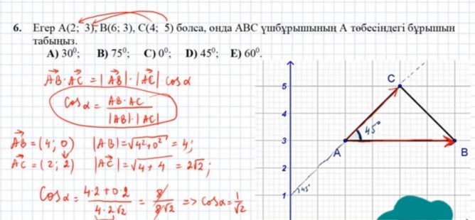 Егер А(2;3), В (6;3), С(4;5) болса, онда АВС үшбұрышының А төбесіндегі бұрышын табыңыз.
