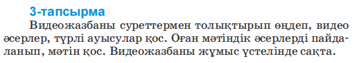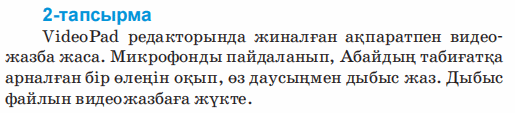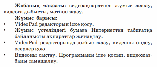 Дескриптор: -VideoPad редакторында жиналған ақпарат пен видео- жазба жасайды Жеке жұмыс. Компьютермен жұмыс 3-тапсырма «Миға шабуыл» әдісі арқылы тапсырманы орындау