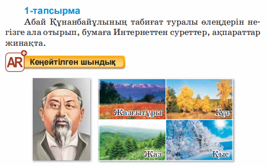 Дескриптор: -Абай Құнанбаевтың табиғат туралы өлеңін негізге ала отырып, бумаға интернеттен суреттер , ақпараттар жинақтайды Жұптық жұмыс 2 -тапсырма «Ойлан . Жұптас. Бөліс» тәсілі жұптасып жұмыс жасайды