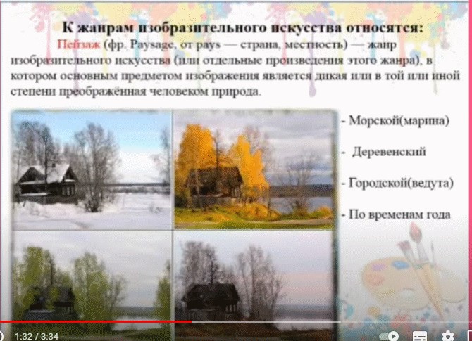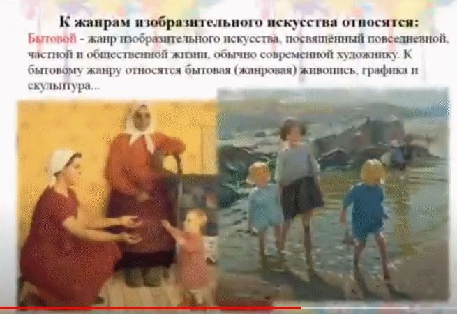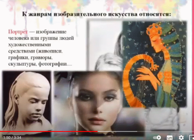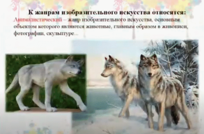 – Предметом нашего разговора, конечно, будет являться изобразительное искусство. Оно очень разнообразно и поэтому делится на жанры. – Что такое жанр изобразительного искусства? Как вы думаете? (Вид художественных произведений, характеризующийся определенными темами) – Давайте познакомимся, какие существуют жанры изобразительного искусства, рассматривая слайды презентации. (Слайд 6) Жанры возникли в разное время. Анималистка – жанр изобразительного искусства, главные герои – животные. Древнейший – анималистический (от фраflЦ.Animale – животное). Именно ему больше всего внимания уделяли первобытные художники. В древнем мире изображения животных были символичны. Сфинкс – олицетворение единства животного и человека, в ассирийской культуре – образ крылатого быка с головой человека, в греческой – кентавра. Анимализм связан не только с изобразительным искусством, но и с литературой. Известный писатель – анималист Евгений Чарушин написал и проиллюстрировал множество своих произведений. Произведения анималистического жанра призывают беречь, любить и изучать животный мир, природу. (Слайд7-9) Портрет – от франц. portrait, от portraire – изображать – изображение человека либо группы людей, существующих или существовавших реально. Портрет – один из ведущих жанров живописи, скульптуры и графики, а также фотоискусства. В основе жанра портрета лежит увековечивание облика конкретного человека. Важнейшим условием портретности является сходство изображения с портретируемым, причем не только внешнее, здесь важно правдиво раскрыть духовный мир конкретного человека как представителя определенной исторической эпохи, национальности, социальной среды. Обычно портрет изображает современное художнику лицо и создается непосредственно с натуры. Почтенный возраст у портретного жанра. Поразительного совершенства (прежде вcего – в скульптуре) он достиг уже в Древнем Египте, почти пять тысячелетий тому назад. Портрет – один из самых распространенных жанров изобразительного искусства. Он имеет разновидности: одиночный, подгрудный, поясной, в рост, парный портрет, групповой, автопортрет. (Слайды10-14) Карикатура от итал. caricatura, от caricare – преувеличивать – особый жанр графического искусства, построенный на использовании элементов сатиры и юмора. В карикатуре сознательно преувеличиваются, обостряются какие-либо внешние или внутренние черты персонажей или явлений. В карикатуре может сочетаться реальное и фантастическое, правдоподобное и абсурдное. При этом всегда преследуется конкретная цель – осмеяние определенного лица или явления. Графическая карикатура получает наибольшее распространение в периоды социальных конфликтов: восстаний, войн, революций. (Слайд15) Пейзаж – от франц. paysage, от pays – страна, местность – в изобразительном искусстве жанр или отдельное произведение, в котором основным предметом изображения является природа. Начиная с эпохи Возрождения пейзажные мотивы неотъемлемы от изображения человека, они лишь указывают на место действия, часто довольно условно (как, например, в русских иконах). Художники Ренессанса обращаются к непосредственному изучению натуры, разрабатывают принципы перспективного построения пейзажного пространства. Пейзажный жанр возник в Европе сравнительно недавно хотя в странах Азии он появился намного с