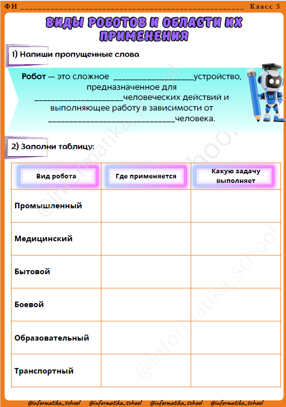 Сформировать у учащихся представление о понятии «робот», видах роботов и областях их применения; научить определять, какие устройства являются роботами, используя модель SENSE – THINK – ACT; развивать умение анализировать устройства и применять полученные знания на практике. |