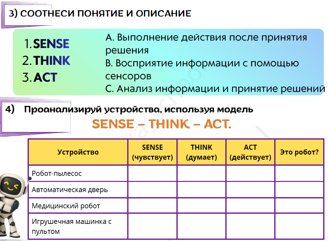 Дескрипторы:- правильно соотносит понятия SENSE, THINK, ACT с их описанием – 1 балл - определяет наличие функций SENSE, THINK, ACT у устройств – 1 балл - делает вывод, является ли устройство роботом – 1 балл Обратная связь: Самооценивание Проверка по шаблону |