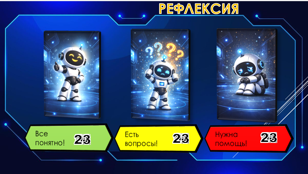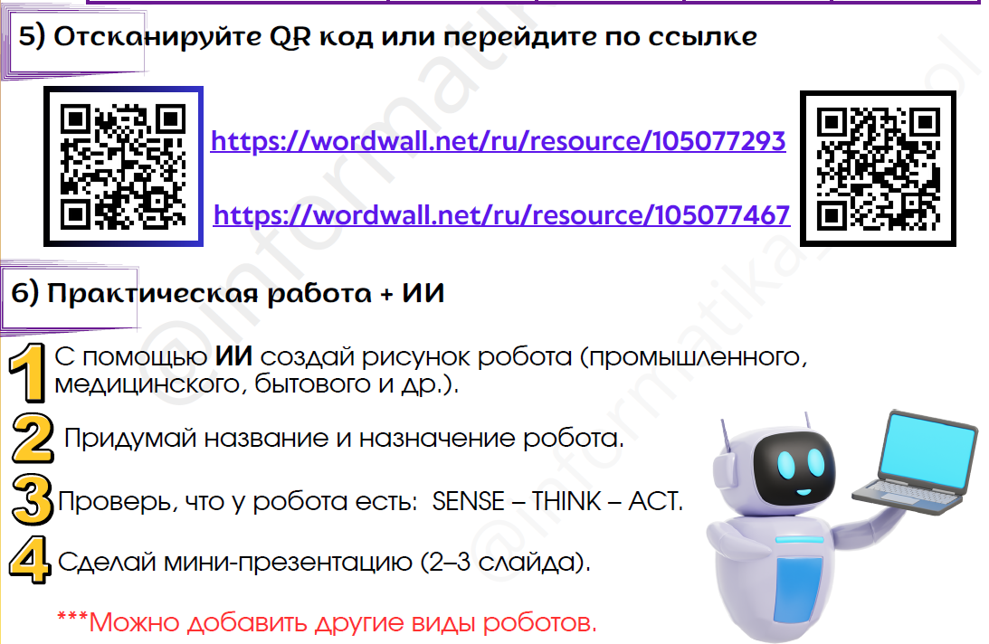Дескрипторы:-выполняет задания на Wordwall – 2 балла - с помощью ИИ создаёт изображение робота – 1 балл - оформляет мини-презентацию – 1 балл Обратная связь: Оценивание учителем Расспрашивание |