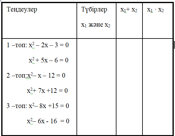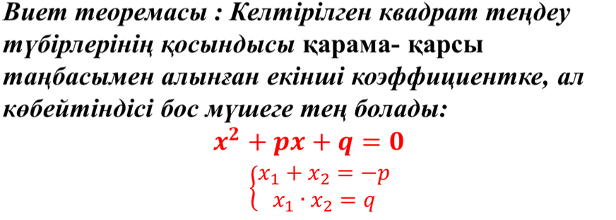 -Виет теоремасын және оған оған кері теореманы біледі, түсінеді; -Виет теоремасын пайдаланып квадрат теңдеудің түбірлерін табады; -Түбірлері арқылы квадраттық теңдеулер жаза алады. |