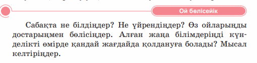 1 тапсырманы орындайды 2-тапсырманы орындайды Тапсырманы орындайды Сергіту сәтін жасайды 4- тапсырманы орындайды |