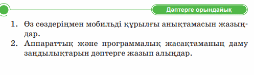 Дискриптор: Жаңа тақырып бойынша топта талдап, ойларын ортаға салады 2 балл Дискриптор: Өз сөздерімен мобильді құрылғы анықмасын жазады Ақпараттық және прграммалық жасақтаманың даму заңдылықтарын дәптерге жазады Дескриптор Сұраққа жауап береді Дескриптор: Онлайн платформада сұрақтарға жауап береді 2балл |