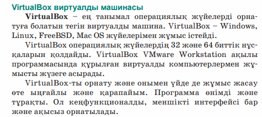 Дескриптор: - Виртуалды компьютердерді құру және басқаруға арналған қандай программа бар екенін айтады - VMware виртуалды машинасын кез келген адам қолдана алмайтын себебін түсіндіреді 2 балл Дескриптор: Дербес компьютермен виртуалды машина арасындағы айырмашылықты айтады, талдайды - 2 балл Дескриптор: Берілген тасырма бойынша сөйлемді аяқтайды Дескриптор: -Жұмыс компьютерлерінде виртуалды компьютер бар жоғын тексереді 2 балл Дескриптор: Онлайн платформа арқылы сұраққа жауап береді 2 балл |