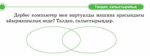 2-топ: не себепті VMware виртуалды машинасын кез келген адам қолдана алмайды? 3-топ Виртуалды машина қалай жұмыс істейді 2- тапсырма. Жұптық жұмыс. «Вен диаграммасы» әдісі бойынша тапсырма беріледі. Сол тапсырмадағы Дербес компьютермен виртуалды машина арасындағы айырмашылықты айтады. Жұптарыңмен талдаңдар.
