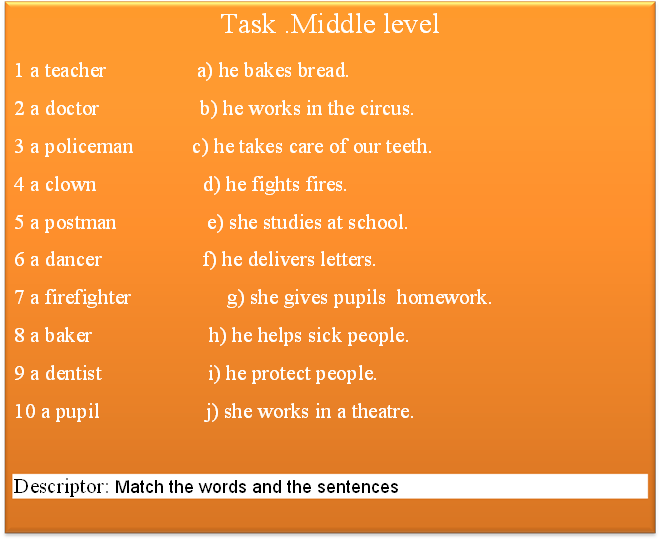 . The aim: To develop pupils speaking skills and create friendly atmosphere Efficiency: By wishing each other they feel better and feel the support of others Students of the class are listed. Students' attention is drawn to the lesson. Determines the topic and purpose of the lesson Students say different words from the video Descriptor: A learner · -asks the name of professions Total – 2 points Descriptor: A learner · find the name of the profession from the picture Total- 1 point Descriptor: A learner -answer the question, read it and translate the words; Total – 3 points Descriptor: A learner - choose the questions and answer them. Total – 2 points Descriptor: A learner Match the words and the sentences Total – 2 points |
