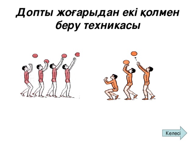2. Бір оқушы допты жоғары көтеріп, қарама-қарсы құрбысына береді. Құрбысы допты қолын көтеріп қабылдап, қайта береді. Арақашықтық 7-8м. Допты қарсыласының қолына дәл беру керек.