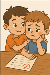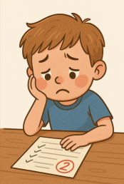 Мальчик получил плохую оценку и очень расстроился. Он сидел за столом и грустил.