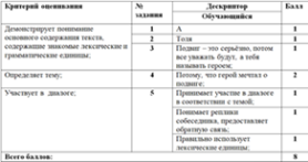 . Дескриптор -понимает текст-1б - составляет 4–5 реплик-1б -отвечает на слова собеседника-1б - использует вежливые выражения -1б Дескриптор - пишет 3–4 предложения по теме-1б - использует слова из текста-1б - передаёт эмоции героя -1б -соблюдает смысл задания.-1б -пишет грамотно и аккуратно-1б -правильно соединяет героев с характеристиками-1б