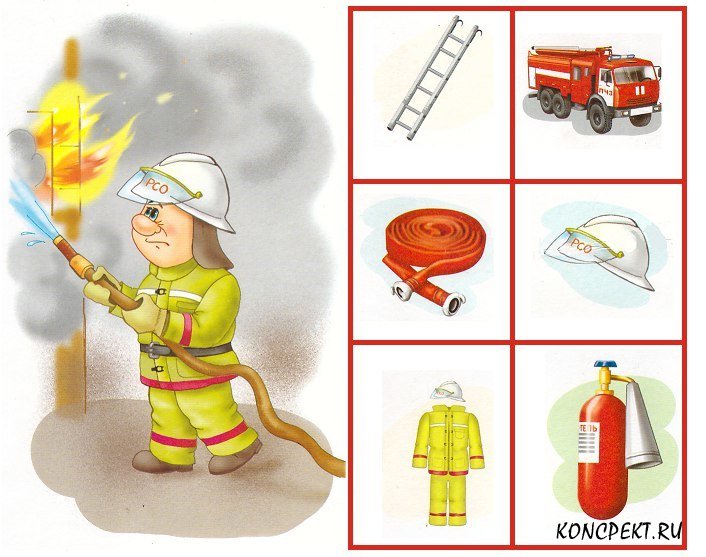 градусник, вата, бинт, йод- нужны врачу; шланг, огнетушитель,