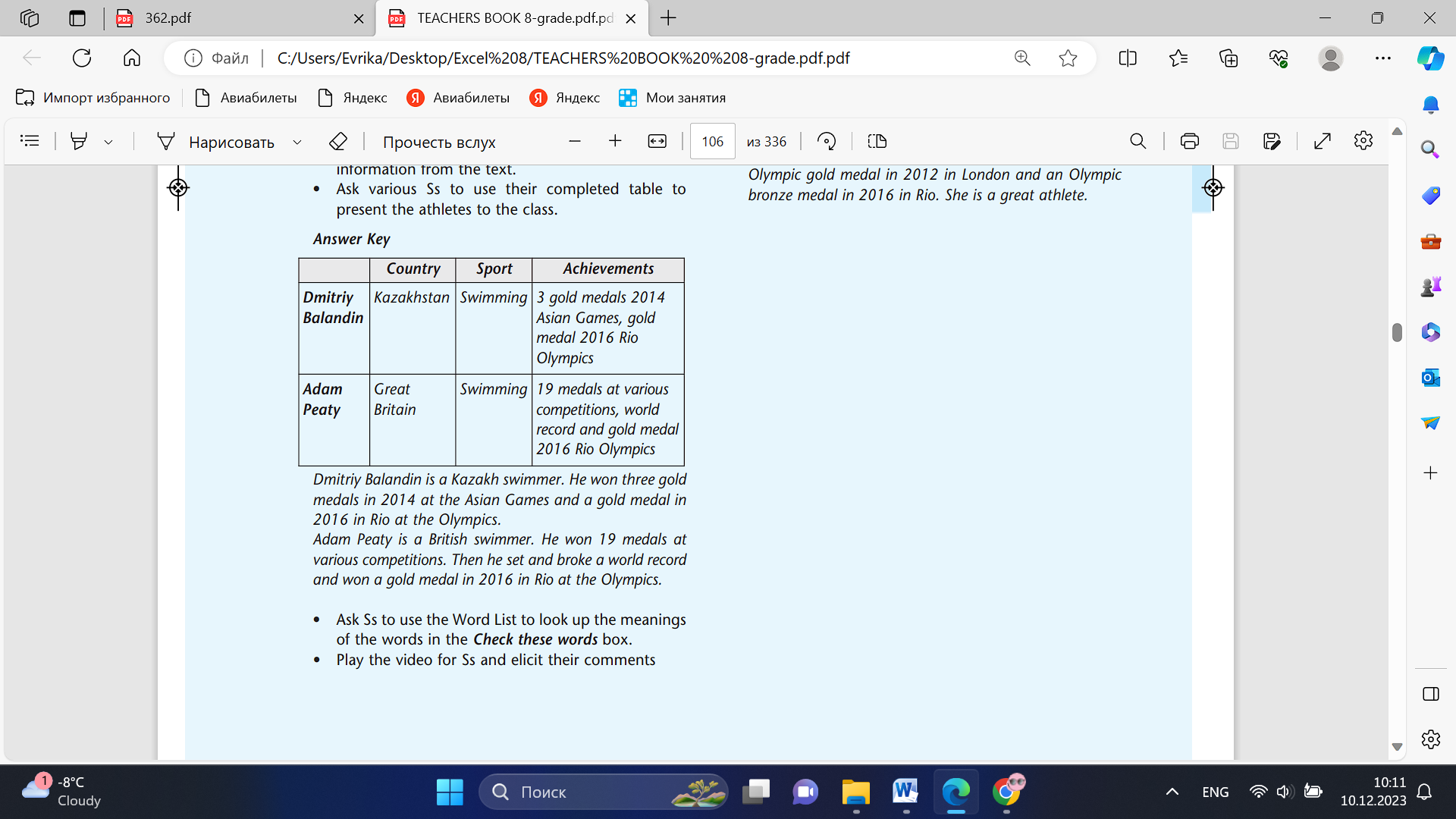 Pupils look at the title and the pictures. Answer the question ANSWERS A: I think they won Olympic medals in swimming. B: Me too. I think they felt very proud. Pupils listen, read and check if you can answer your questions. Write a few questions. ANSWERS Where are they from? (Dmitriy Balandin is from Kazakhstan and Adam Peaty is from Great Britain.) Where did they win their medals? (Rio) Pupils copy and complete the table with information from the text. Then present the two athletes to the class. ANSWERS
