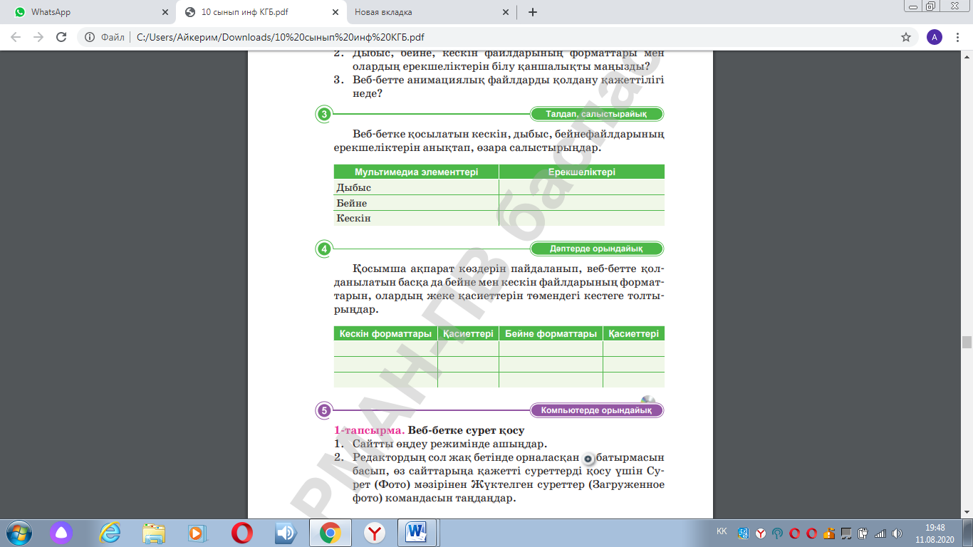 Жаңа сабақ. Сыныптық жұмыс. Бейнебаян көрсетілімі арқылы. Топтық жұмыс: ДЖИГСО әдісі Тапсырма №1 Веб-бетке қосылатын кескін, дыбыс, бейнефайлдарының ерекшеліктерін анықтандар