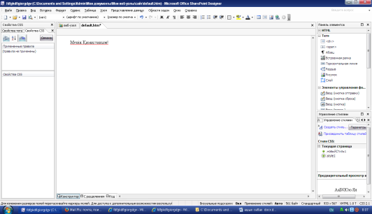 Осылайша Share Point Designer жұмысы басқа да web-редакторлардағы сияқты web-парақтың сыртқы бейнесімен қатар кодтарын редакторлай алады. Конструктор аймағында басқару элементін орнату арқылы, сол аумаққа керекті өзгерістерді тез жасаймыз. Мысалы, мәтінді енгізу және өзгертуді орындап көрейік. Ол үшін web-редакторды іске қосамыз. Бос бет ашылады. Осы беткі мәтін қосу үшін мына әрекеттерді орындаймыз: