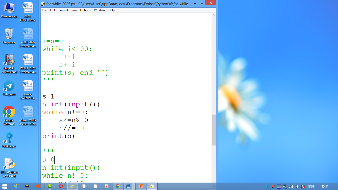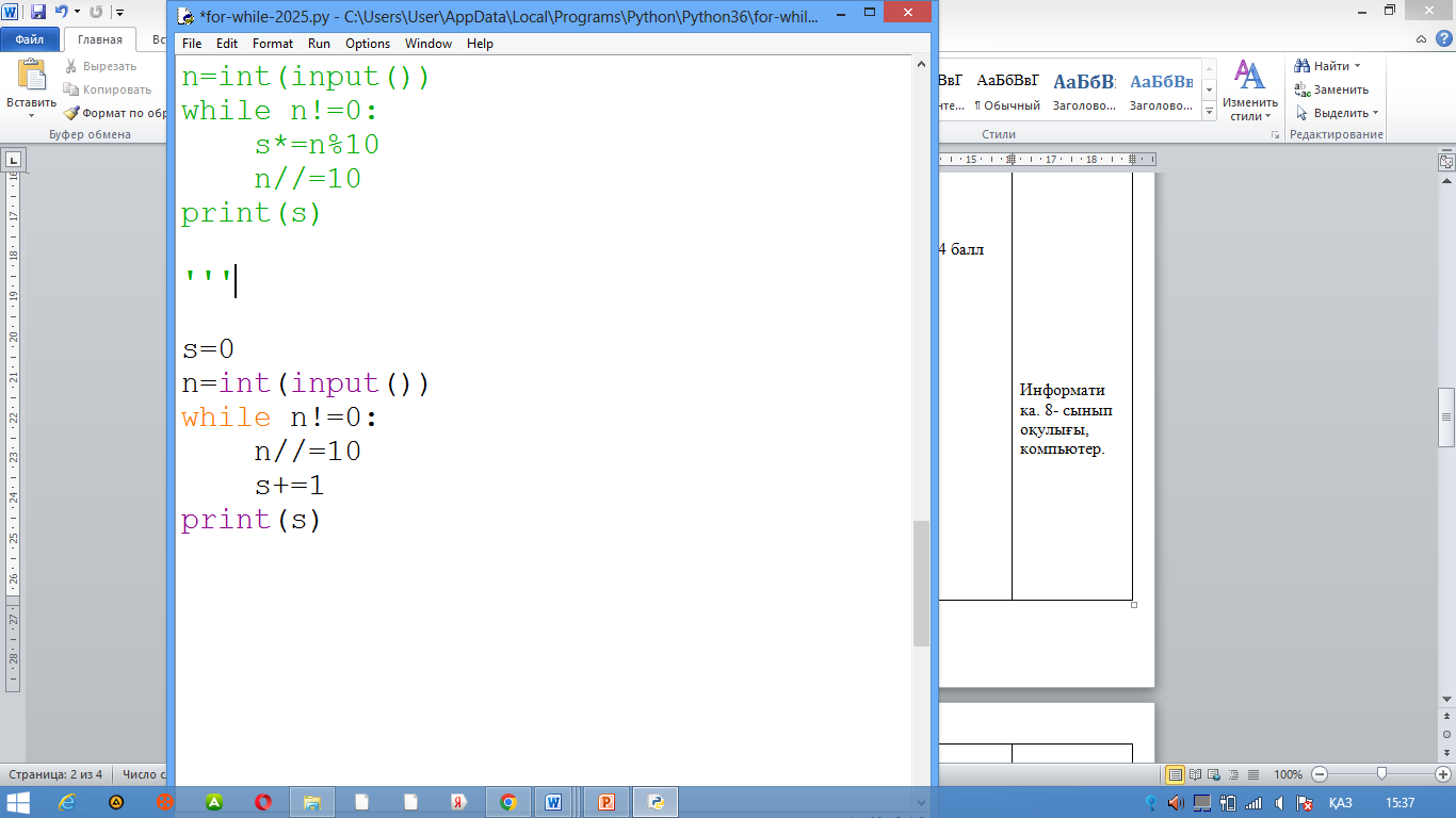 2) жолы s=input() print(len(s)) Дескриптор: -Санның неше таңбалы сан екенін анықтау кодын жазады; -Программада while циклін қолданады; -Программа кодын тексереді. № 3-есеп. Python-да жазылу коды.