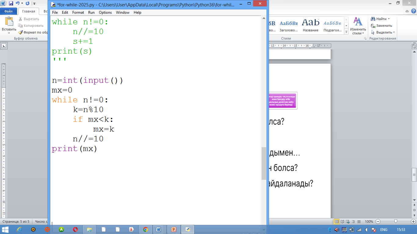 2) жолы s=input() a=list(s) print(max(a)) Дескриптор: -Санның үлкенін табу кодын жазады; -Программа кодын компьютерде тексереді. 4) Берілген программа кодын талдаңдар. Программа жұмысын аяқтағанда экранға қандай нәтиже береді? Программа нәтижесіне қарап, есептің шартын анықтаңдар.