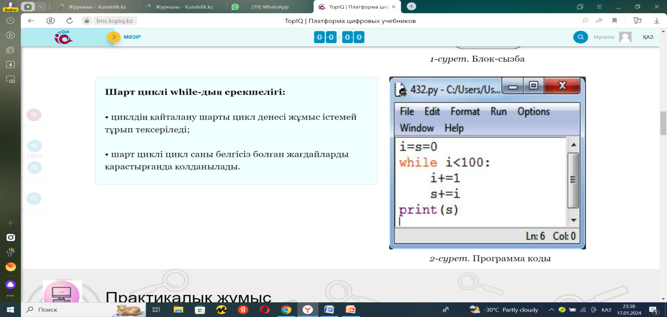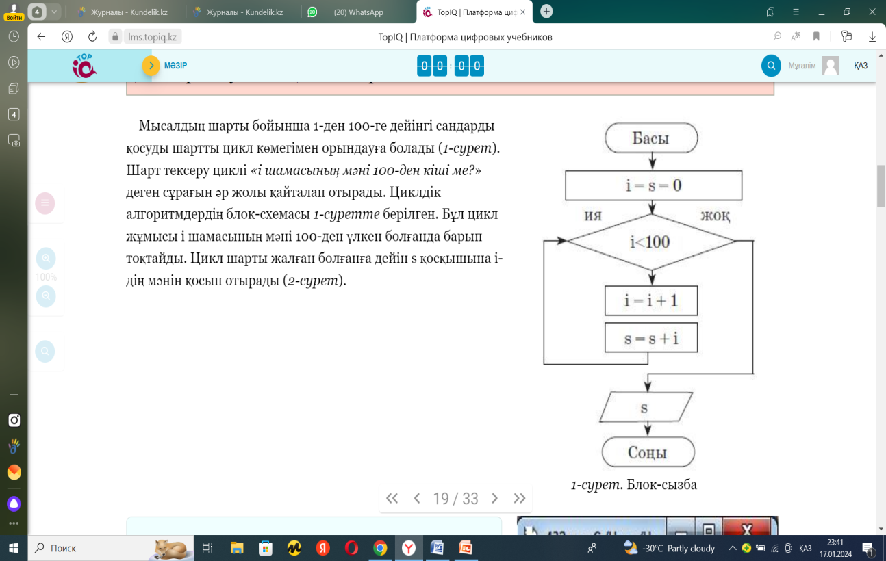 Мысалдың шарты бойынша 1-ден 100-ге дейінгі сандарды қосуды шартты цикл көмегімен орындауға болады (1-сурет). Шарт тексеру циклі «і шамасының мәні 100-ден кіші ме?» деген сұрағын әр жолы қайталап отырады. Циклдік алгоритмдердің блок-схемасы 1-суретте берілген. Бұл цикл жұмысы і шамасының мәні 100-ден үлкен болғанда барып тоқтайды. Цикл шарты жалған болғанға дейін s қосқышына і-дің мәнін қосып отырады (2-сурет) 1-тапсырма. Практикалық жұмыс. 3 –есеп беріледі