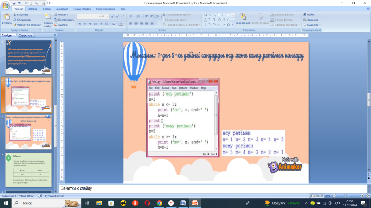 Оқушылар жаңа сабақты түсініп, бейнекөрсетілімді көріп, өз ойларын тұжырымдайды. Балалар тақырыпты түсінеді, программа кодын жазып, мысалды талдайды