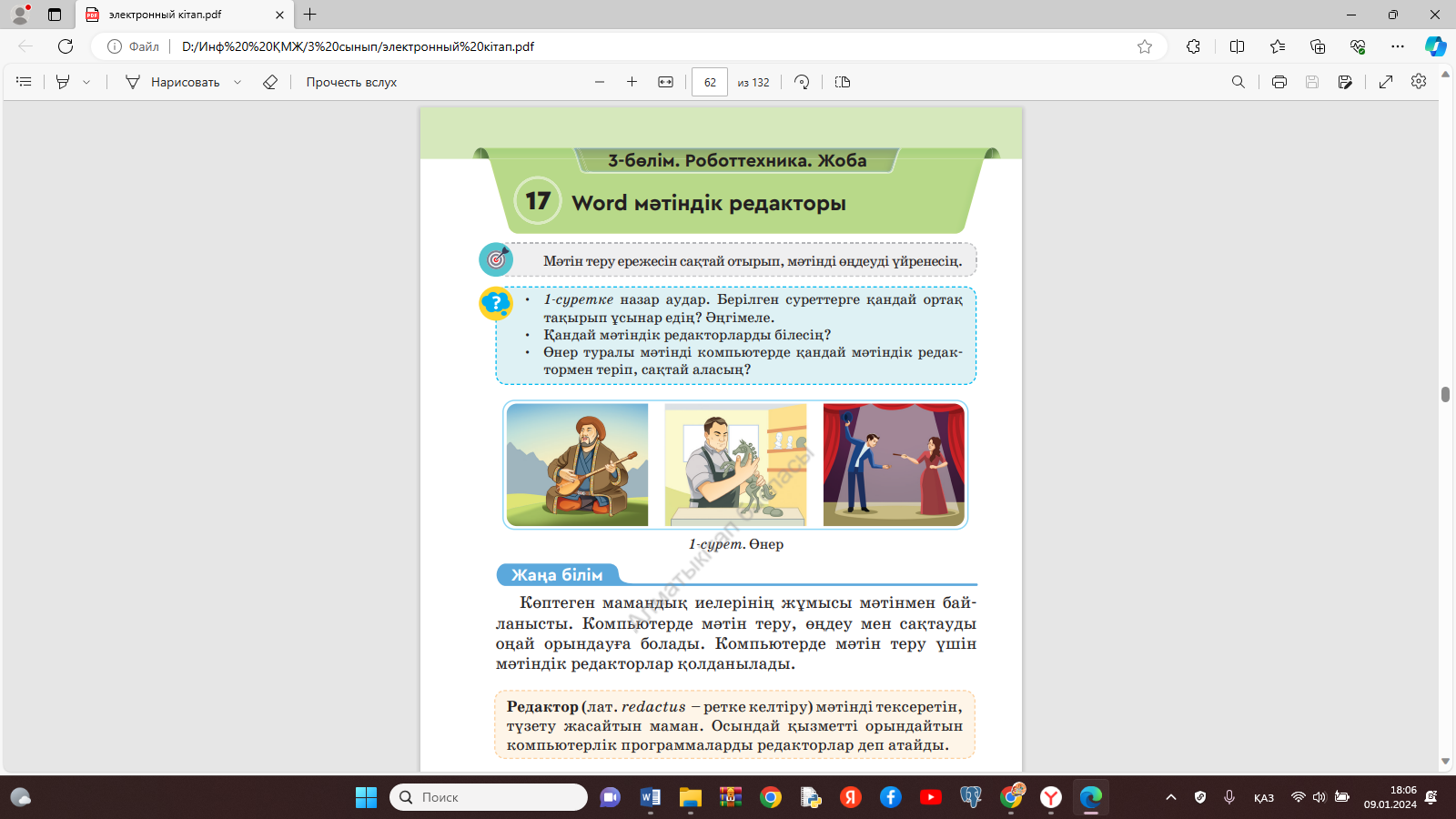 Жұмыс дәптерімен тапсырмалар ұсыну 1 тапсырма Мәтіндік редакторды іске қос. 2. Жаңа құжат құр (3-сурет, қызыл бағыттамалар). 3. Жұмыс алаңының ортасына тінтуірмен шертіп, «Өнер» деп тақырыбын тер. 4. Мәтін теру ережесін сақтай отырып, «Өнер» мәтінін тер. 5. Терген мәтініңді сақта (3-сурет, жасыл бағыттама) Орында тапсырмасы