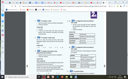 b) To practise joining viewpoints to reasons/examples using appropriate linkers. • Explain the task and give Ss time to complete it. • Check Ss’ answers. Suggested Answer Key To start with, large mammals need to run free in their natural habitat. For example, animals such as lions and cheetahs have limitless space to run in the wild, but in captivity they are confined to small enclosures. Furthermore, animals in captivity can be dangerous. For instance, they might attack their keepers or other animals in their enclosure if they are scared or angry. Moreover, zoos and sanctuaries can provide animals with medical treatment. This means that sick or injured animals that would not survive in the wild, in captivity they have a chance of getting better. On the other hand, wild animals lose their skills and identity in captivity. For instance, predators like lions forget how to hunt because they are given fresh meat every day. Some people argue that animals can die of hunger and thirst in the wild. However, in captivity animals are well-cared for and have all the food and water they need.