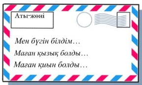 Жылы лебіздерін білдіре отыра, жүректі бір-біріне табыстайды «Тақия» таңдап, топқа бөлінеді. Жазушының өмірі мен шығармашылығына байланысты сұрақтарға жауап береді. Шығармаға байланысты сұрақтарға жауап береді. Сұраққа жауап береді. Бүгінгі сабақты болжайды. |