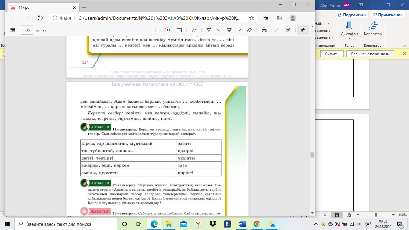 Тапсырма. Мәтінді оқып, мазмұны бойынша төмендегі тапсырмаларды орындаңыз. Адамның сыртқы келбеті мен киім киюі оның оның ішкі дүниесінен де хабар беріп тұратыны ертеден мәлім. Кез келген адамды бір көргенде-ақ оның көзі,қасы, беті, дене бітімі,қылығы, киім киісі саған әрқилы әсер етеді. Онымен танысып,әңгімелесіп,араласып кетпей тұрып-ақ, ол адам жөнінде өзіндік пікір де қалыптастырып үлгересің. Бұл- адамның сыртқы келбеті арқылы-ақ танып білу қасиеті.Әйтеуір ,адамның сыртқы келбеті бір қарағанда не сүйсіндіреді, не одан жирендіреді,тіпті, таң-тамаша қалдырады. Адамның қадір-қасиеті мінез-құлқына қарай бағаланады десек те, оның талғамы мен өмір салтын сыртқы келбеті аңғартатыны анық. Кейде адамның сыртқы келбеті оның талай-тағдырына да әсер етеді. Өйткені адамның сыртқы келбеті тартымды болмаса, ішкі жан дүниесі көбімізді қызықтыра бермейтіні белгілі. Бұл өмірде адамдардың жан дүниесін танып білудің ,әрқайсысынң сана-сезімімен санаса келіп, олардың жеке-дара өзгешеліктерін түсіне білудің маңызы айрықша. Ол,әрине, өзара қарым-қатынас жасау,сыйласу барысында анықталатын жайттар. Осы жерде мына мақал-мәтелдерді айта кеткен жөн. «Жақсыдан үйрен, жаманнан жирен», «Жақсылыққа жақсылық- әр кісінің ісі, жамандыққа жақсылық- ер кісінің ісі»,»Жаяуға жол алыс» . Тек есте болатын бір жағдай, жеке адамның әртүрлі ерекшеліктерінің дамып, қалыптасуы оның өзі өмір сүріп отырған ортасына, ондағы қоғамдық қатынастарға да тәуелді. Бірте-бірте мүлде бөгде өмір салты қалыптасады.Соған қарамастан, адам тану бойынша зерттеу жүргізушілер адамның сыртқы кескін-келбеті, жүріс-тұрысы,сөйлесу,сәлемдесу әдебі арқылы –ақ оның қандай мінезді, ақыл-парасатының, ерік-күшінің, белсенділігінің қаншалықты екенін аңғаруға болады деп есептейді. «Кітапты қабына байланысты бағалама» деген сөздердің адамға қатысты да көп айтылатынын бәріміз білеміз. Алайда осы арада адамдардың пікірі екіге бөлінеді. Біреулері «сырт келбеттің ішкі әлемге еш қатысы жоқ» десе, екінші топтағылар «адамның сырт келбеті оның мінезін, ойын анықтайды» деп жатады. Адам баласы өмірге келгенде өзінің түрін, келбетін өзі таңдамайды. Бірақ өмір сүру барысында сырт келбетін дұрыс қалыптастырып, күтім жасауының арқасында бақыт құсын қолына қондырса, келбетінің кесірінен армандарын желге ұшырып алуы да әбден мүмкін.Сондықтан сыртқы келбетке аса мән берген жөн.Талғамды