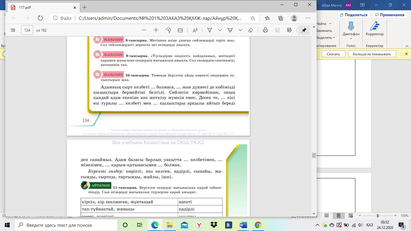 Бірлескен жұмыс (1, 2 тапсырма) Тапсырманы ұсыну және дұрыс жауапты ұсыну арқылы үйрету |