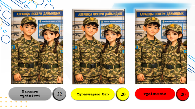 Тақтадағы жұлдызшаларды басу арқылы үш топқа бөлініп, орындарына барып тұрады. ? ЖЕБЕ тобы «Біз — дәлдік пен жылдамдық символымыз! ⚔️ НАЙЗА тобы «Біз — күш пен батылдық символымыз!» ?ҚАЛҚАН тобы «Біз — қорғаныс пен сенімділіктің символымыз!