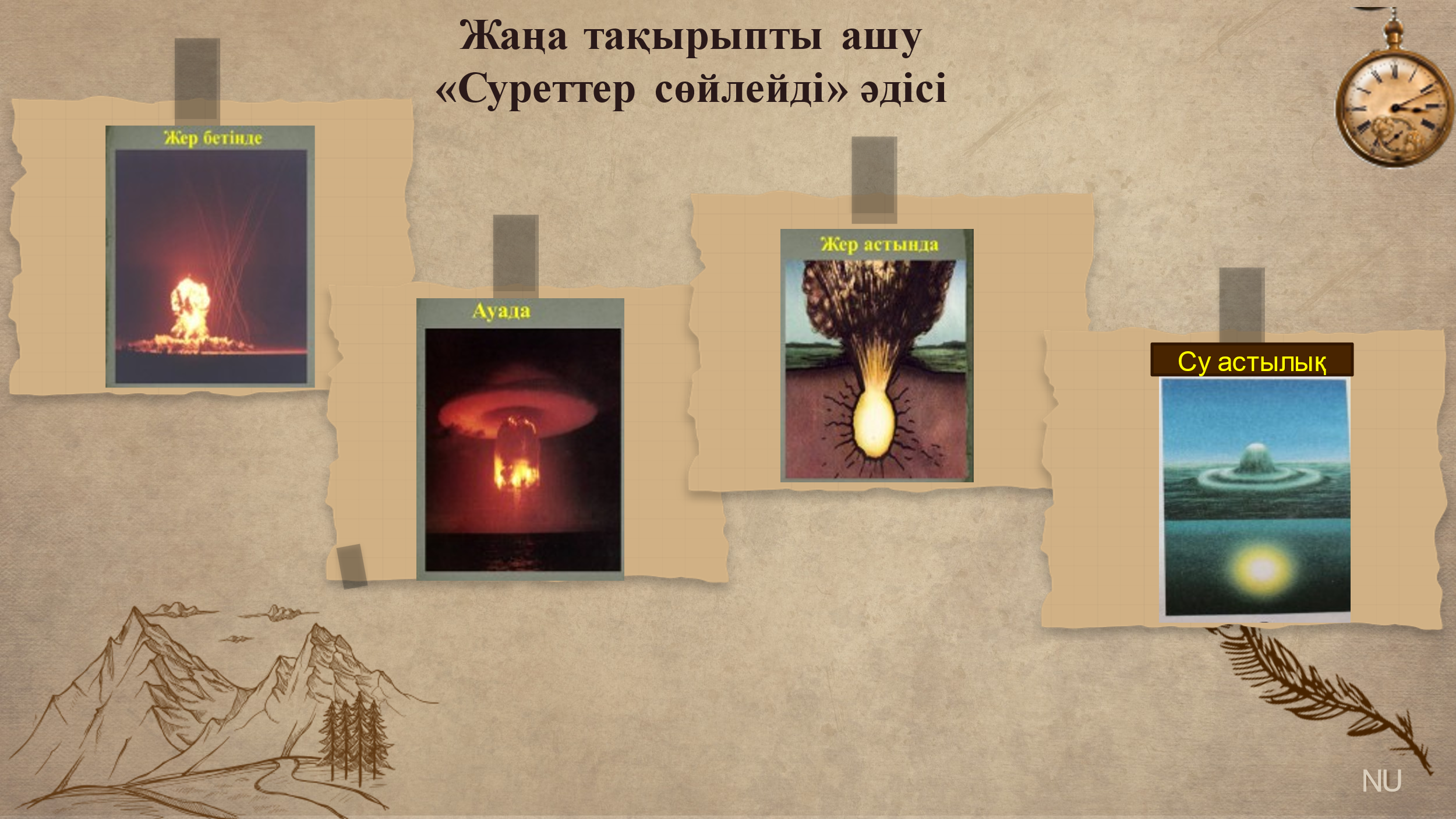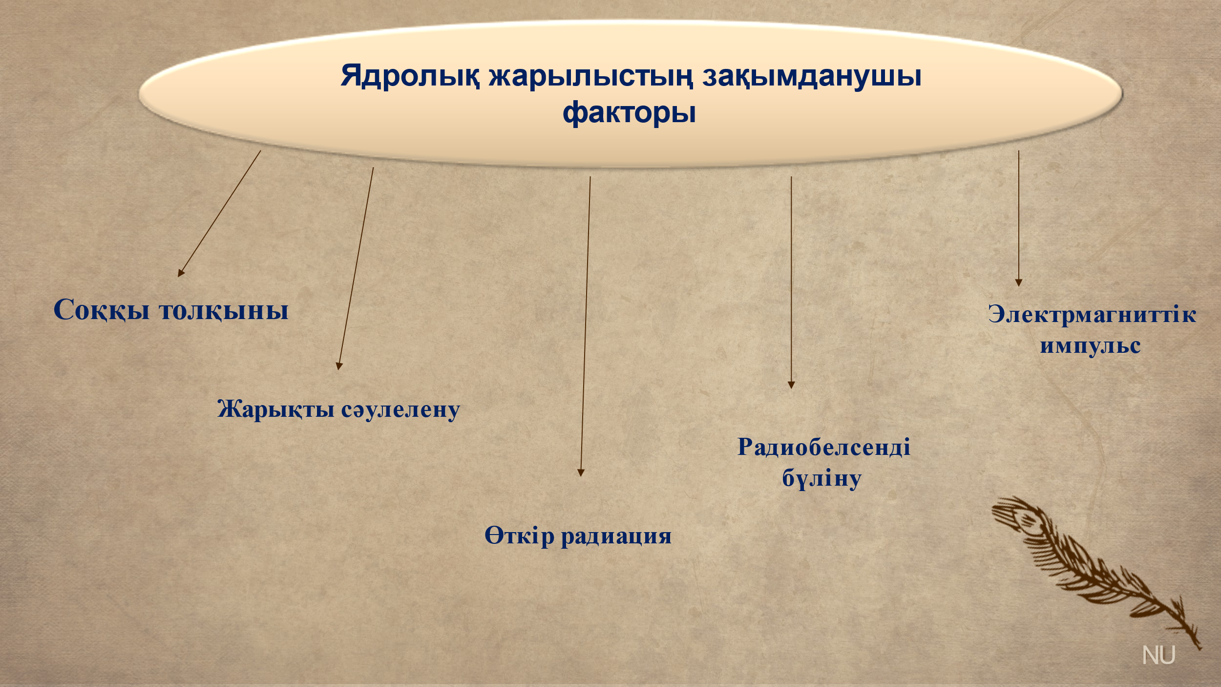 «Суреттер сөйлейді» әдісі Ядролық жарылыстың зақымданушы факторы -Соққы толқыны -Жарықты сәулелену -Өткір радиация -Радиобелсенді бүліну -Электрмагниттік импульс